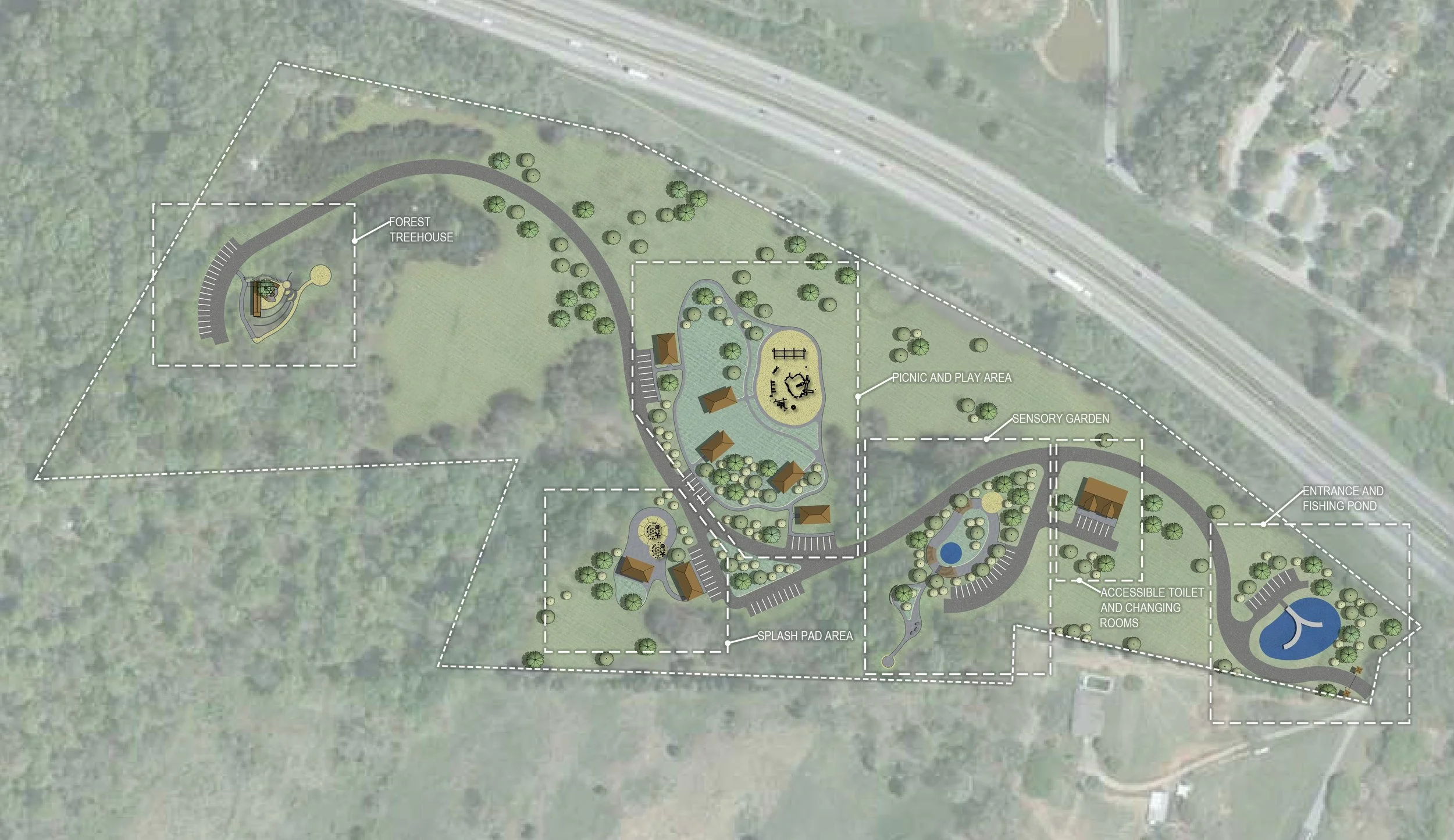 Summit Leadership Foundation invited TWA to conceptualize an inclusive play facility as a part of their new venture, Trinity Grace Farm. TWA enlisted the expertise of CHA to develop an innovative master plan including a fishing pond, sensory garden, picnic and play areas, splash pad, and accessible tree house. The resulting design is a 30-acre wonderland for individuals and families with special needs.